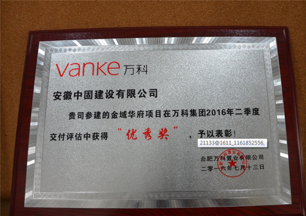 近日,由公司承建的合肥萬科金域華府項目傳來捷報,在萬科集團2016年二季度交付評估中獲得“優秀獎”,合肥萬科置業有限公司對我公司予以表彰。此獎項既是對公司各項施工質量的肯定,也是對公司項目管理團隊在項目交付過程中的配合度的認同。