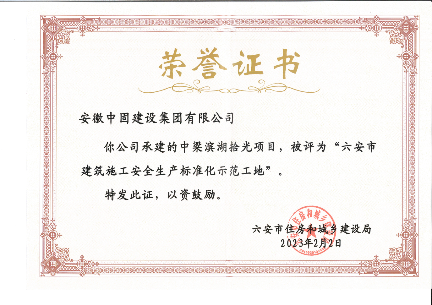 舒城中梁濱湖拾光項目被評為“六安市建筑施工安全生產標準化示范工地”