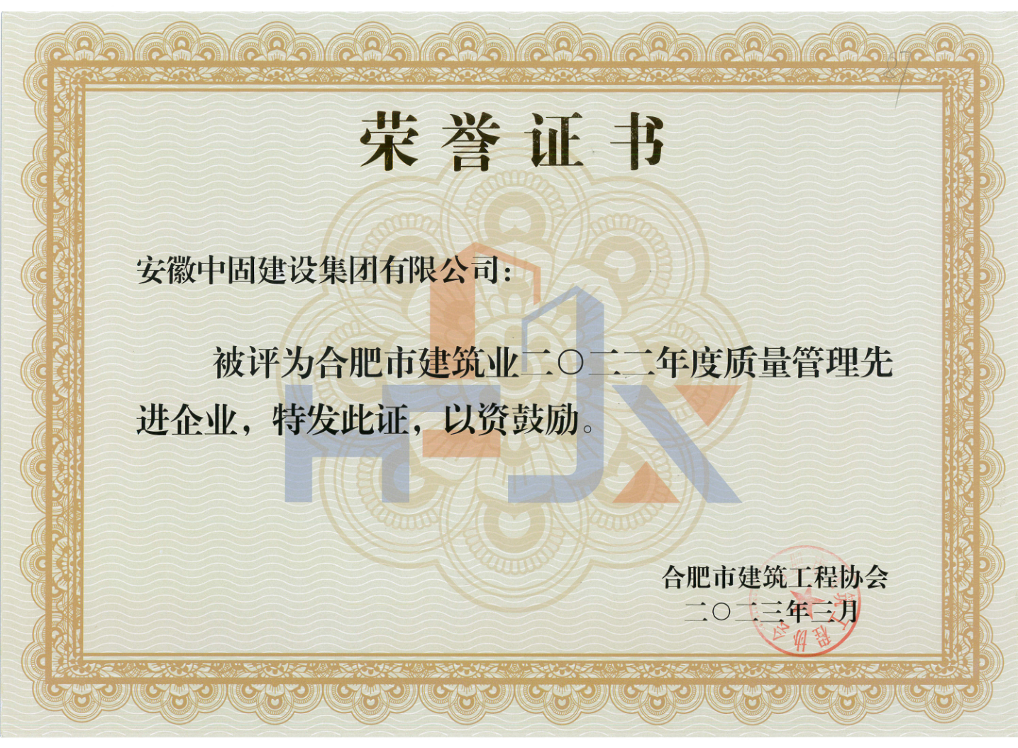 安徽中固被評為“合肥建筑業2022年度合肥建筑業質量管理先進企業”